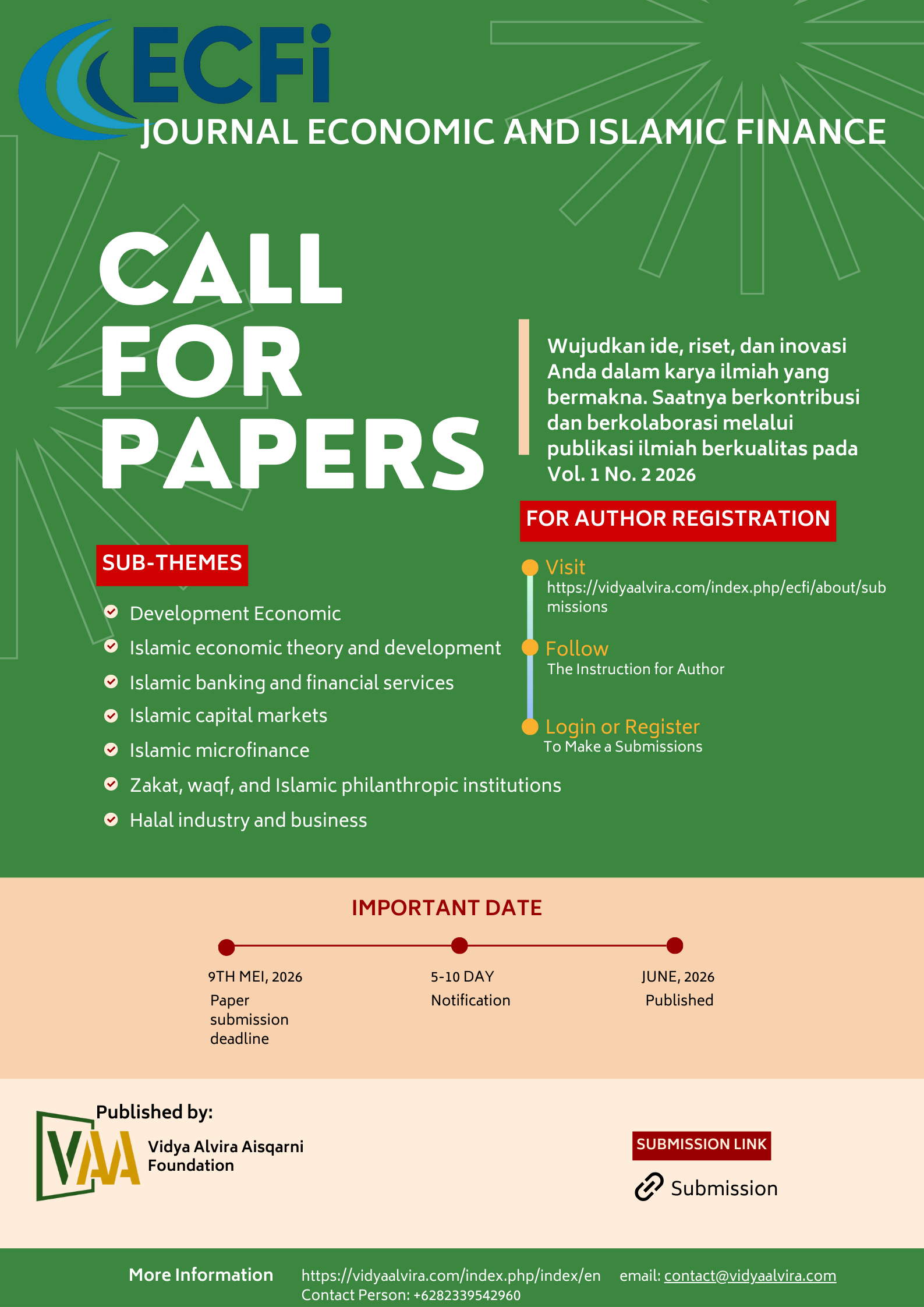 Journal of Economic and Islamic Finance (ECFi) is a peer-reviewed academic journal that publishes original research articles, conceptual papers, and literature reviews in the fields of economics and Islamic economics and finance. The journal covers a broad range of topics, including Islamic economics, Islamic financial institutions, Islamic fiscal and monetary policy, Islamic public finance, and innovations in Sharia-compliant finance.